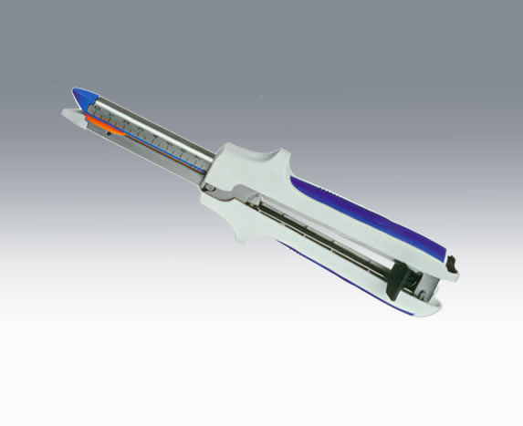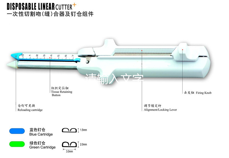 一次性直線切割手術(shù)吻合器是在組織上擊入成直線排列的四排互相交錯的縫釘,組件內(nèi)的切割刀同步將組織離斷。應(yīng)用該器械可以節(jié)省手術(shù)時間、減少病員出血、能更方便地進行手術(shù)縫合。本器械有六種規(guī)格以適應(yīng)不同組織:55mm,60mm,75mm,80mm,90mm,100mm。另外可調(diào)的縫釘高度分別有:2.5mm,3.85和4.5mm,以彌補各種厚度的組織。