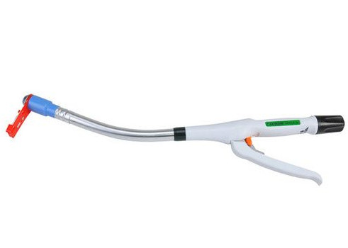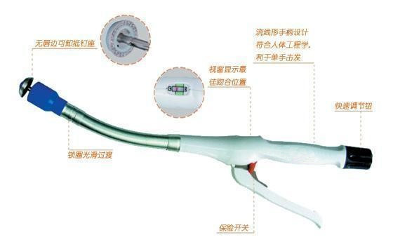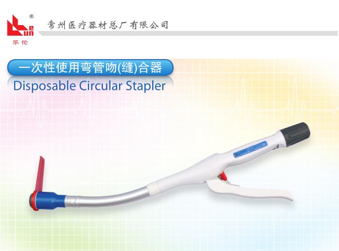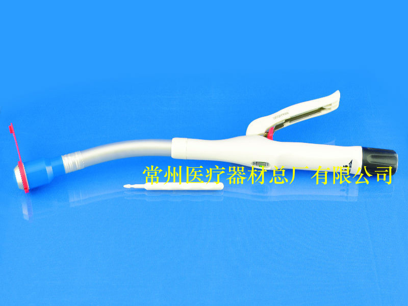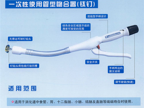 一次性彎管吻合器是在組織、器官上擊入成圓形排列的兩排互相交錯(cuò)的縫釘,并同時(shí)以環(huán)形刀將其內(nèi)側(cè)的組織切斷。應(yīng)用該器械可以節(jié)省手術(shù)時(shí)間、減少病員出血、能更方便地進(jìn)行手術(shù)縫合。本器械有六種規(guī)格以適應(yīng)不同組織。